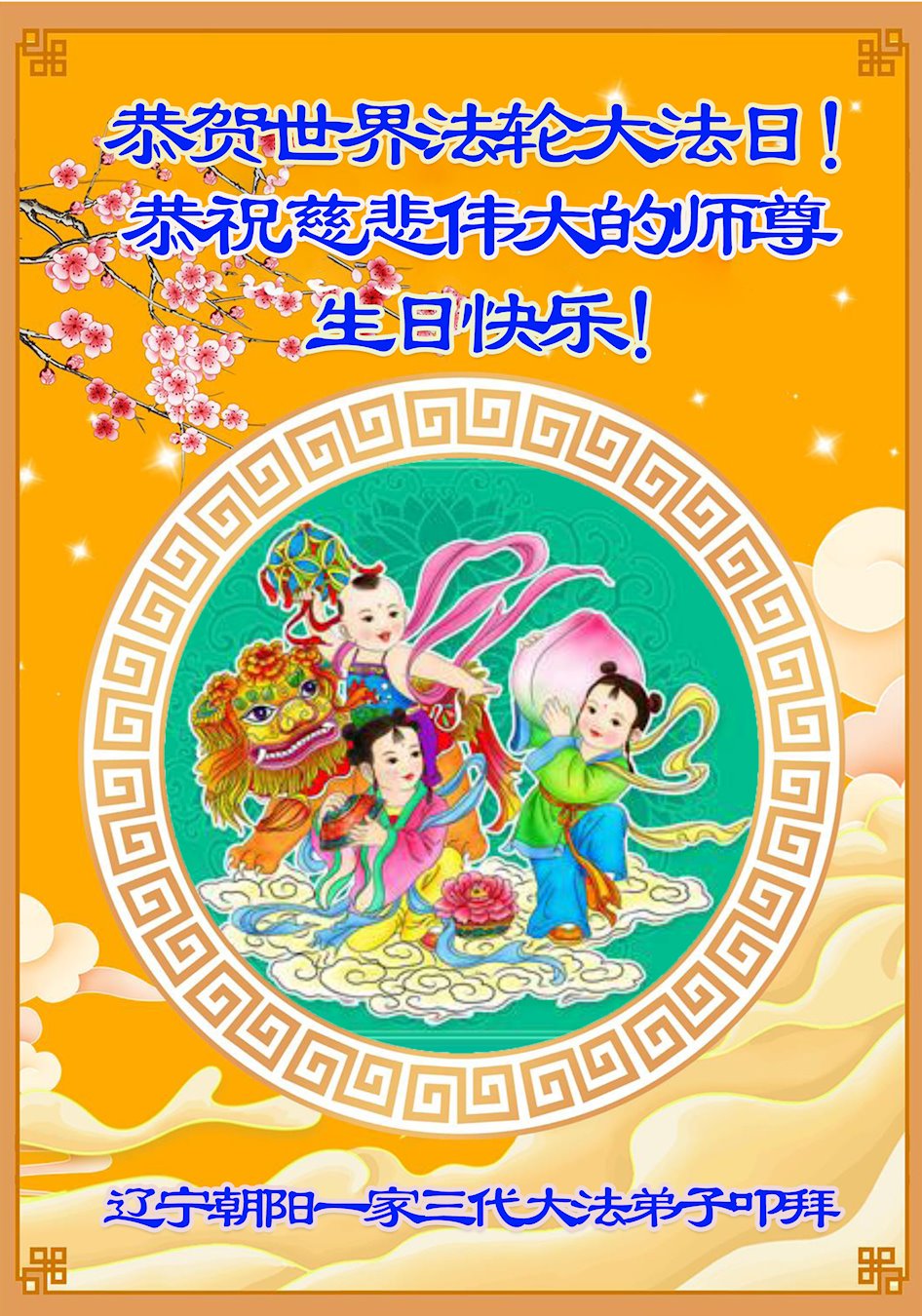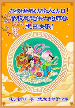 辽宁朝阳一家三代大法弟子庆贺世界法轮大法日!恭祝慈悲伟大的师尊生日快乐!辽宁朝阳一家三代大法弟子敬贺 辽宁省朝阳市凌源市一家三口大法弟子恭祝师尊生日快乐!