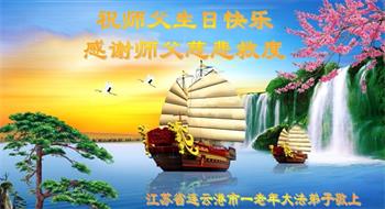 普天同庆欢庆世界法轮大法日!全家会共同精進,做好三件事,圆满随师还。 江苏省连云港市一老年大法弟子恭贺世界法轮大法日!祝师父生日快乐!