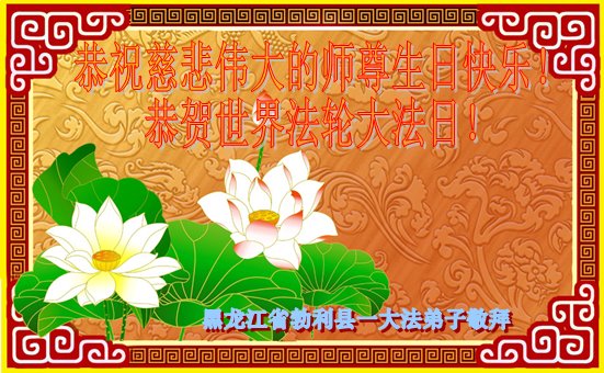 感恩师父把这么好的大法传给我们,使我们找到了回家的路,弟子唯有精進实修,做好三件事,以报师恩。 黑龙江省牡丹江市一大法弟子及家人恭贺世界法轮大法日!