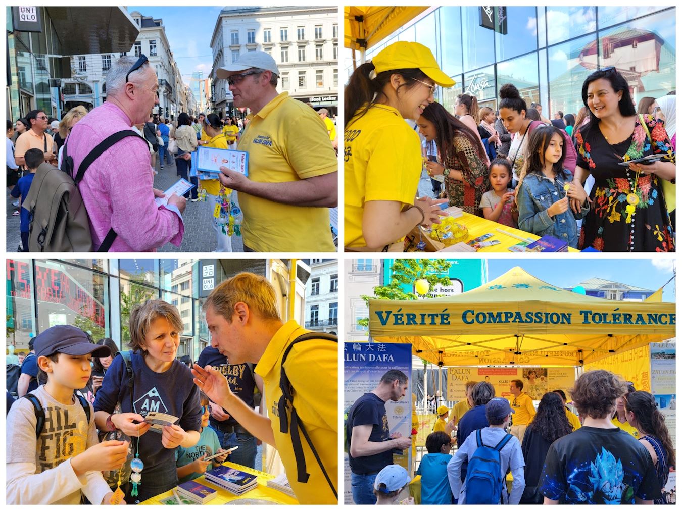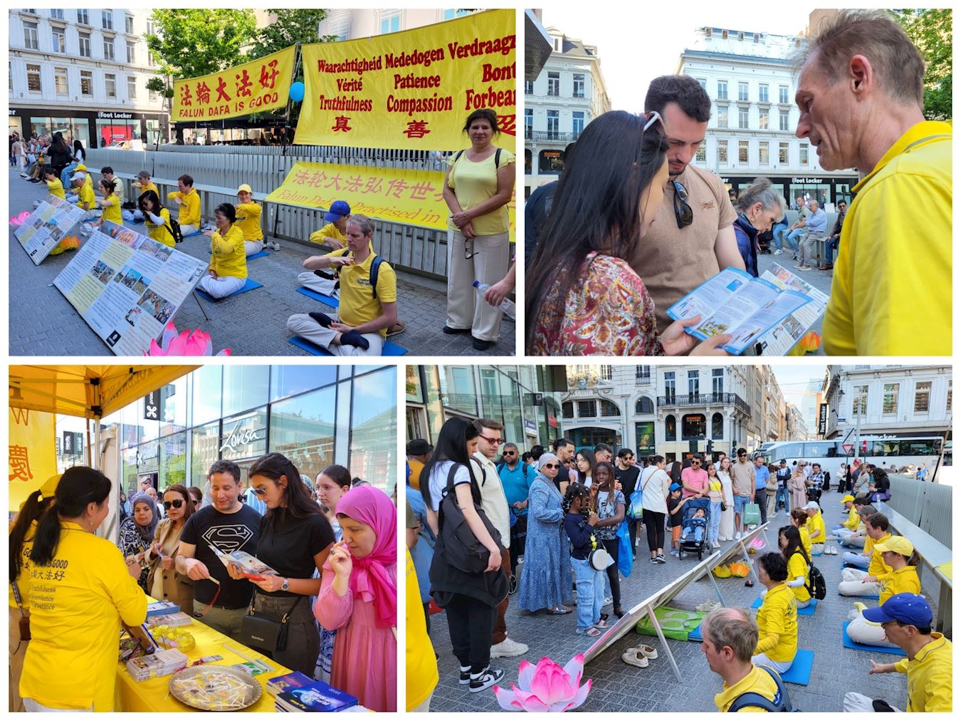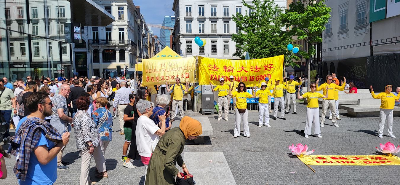 | 【明慧网二零二四年五月十四日】(明慧记者比利时布鲁塞尔报道)二零二四年五月十一日,阳光明媚。比利时法轮功学员在布鲁塞尔拉莫奈(La Monnaie)广场,庆祝5.13世界法轮大法日的炼功场面,吸引众多民众驻足观看,并咨询如何学炼法轮功。世人赞叹法轮大法真善忍的美好以及学员炼功场的祥和宁静。 拉莫奈(La Monnaie)广场以拉莫奈皇家剧院命名,与商业大街衔接。周末是各种活动场所所在地。这天也不例外,另一边还有一个音乐集会,音乐的吵闹声很大。但是并不影响学员祥和宁静的炼功场。强烈的对比下,让很多人过来了解法轮大法。  图1:比利时部分法轮功学员合影留念,欢庆大法世界法轮大法日。 |