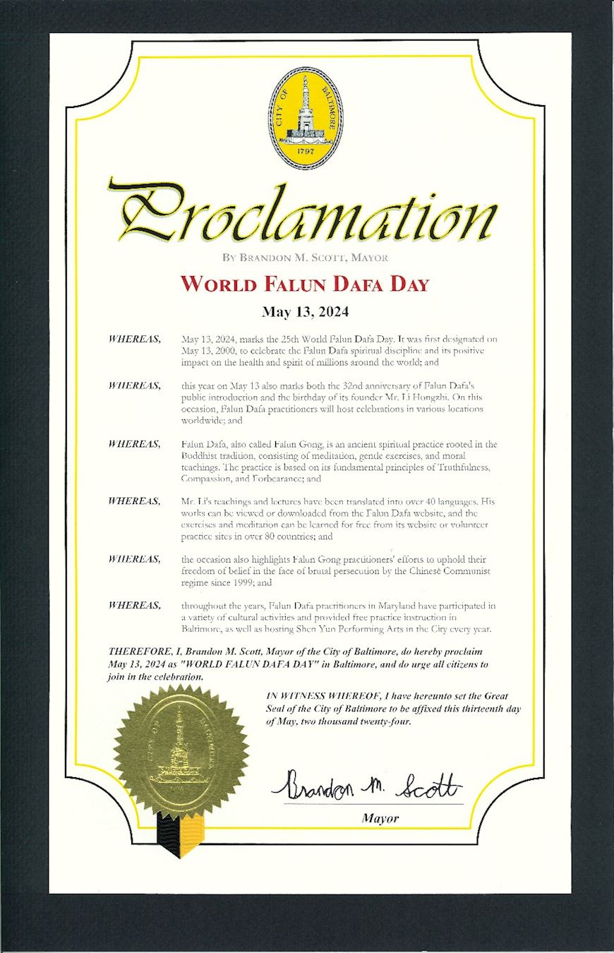 | 【明慧网二零二四年五月十四日】二零二四年五月十三日世界法轮大法日来临之际,美国马里兰州巴尔的摩市长布兰登·斯科特 (Brandon M. Scott)颁发褒奖,将二零二四年五月十三日定为法轮大法日。美国马里兰州巴尔的摩市长布兰登·斯科特 (Brandon M. Scott)和他颁发的褒奖状 褒奖令译文如下: 布兰登·斯科特 (Brandon M. Scott),市长 世界法轮大法日 二零二四年五月十三日 鉴于,二零二四年五月十三日是第二十五届世界法轮大法日。为庆祝法轮大法的精神提升作用及其给全世界数百万人的身心带来的积极影响,二零零零年的五月十三日被确立为首届世界法轮大法日;以及 鉴于,今年五月十三日也是法轮功创始人李洪志先生公开传法三十二周年纪念日,这一天也是李洪志先生的华诞;全球的法轮功学员都将在这一天举行多种庆祝活动;以及 鉴于,法轮大法,又称法轮功,是佛家传统的精神修炼功法,包括打坐、柔和的炼功动作及道德规范。法轮功以真、善、忍为核心,以及 鉴于,李洪志先生的讲法及著作已经被译成四十多种语言,法轮大法官方网站可以免费浏览及下载,人们可以上网学功,八十多个国家都有义务教功点,以及 鉴于,一九九九年以来,面对中共的残酷迫害,法轮功学员努力坚守信仰自由,以及 鉴于,多年来,马里兰州的法轮大法修炼者在巴尔的摩市参加了各种文化活动,并免费教功,而且每年在巴尔的摩市主办神韵演出。 因此,我,巴尔的摩市市长布兰登·斯科特,宣布二零二四年五月十三日是巴尔的摩市的“世界法轮大法日”。我鼓励巴尔的摩市的居民们一起来庆祝这一天。 我已于2024年五月十三日加盖巴尔的摩市印为见证。 布兰登·斯科特 市长