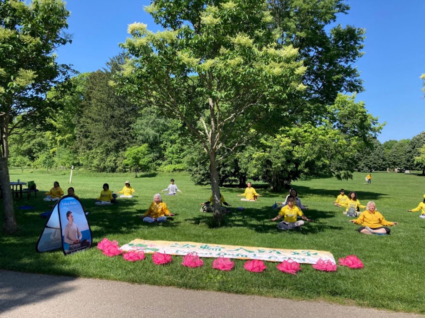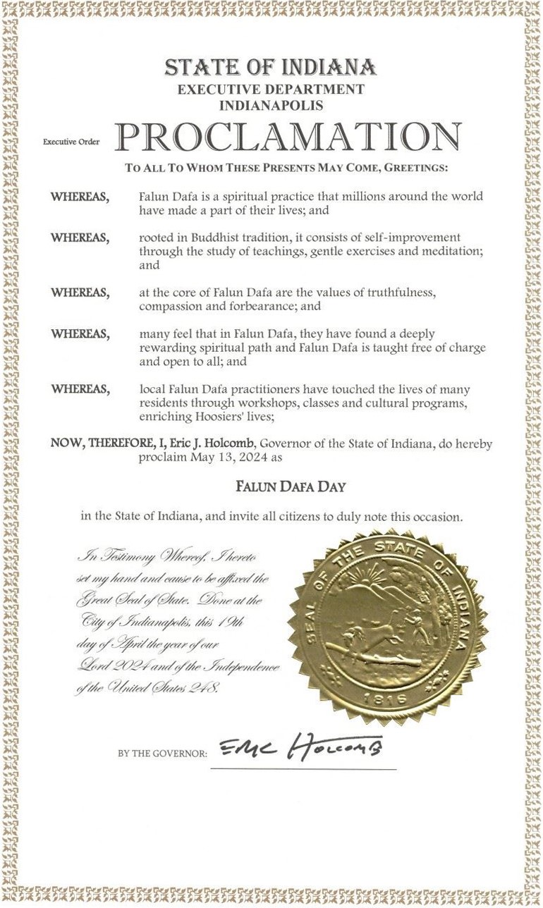 | 【明慧网二零二四年五月十四日】二零二四五月十二日,来自美国印第安纳州各地法轮功学员在首府印第安纳波利斯的霍利迪公园,庆祝世界法轮大法日,并恭祝伟大的师尊生日快乐。 印第安纳州州长埃瑞克·霍科姆(Eric Holcomb)颁发褒奖,宣布“二零二四年五月十三日为法轮大法日,并请全州公民共同见证”。 印第安那州州长埃瑞克·霍科姆(Eric Holcomb)和他颁发的褒奖令下面是褒奖的译文: 基于,法轮大法是一种被世界上几百万人作为他们生活一部份的修行方式; 基于,根植于佛家传统文化,他通过对(宇宙原理)教导,舒缓的动功和静坐的学习从而达到自我提升; 基于,法轮大法的宗旨是真、善、忍普世价值; 基于,很多人在法轮大法中找到了受益匪浅的精神之路;且法轮大法面向公众提供免费教学; 基于,当地的法轮大法学员通过讲座、课程、和文化节目,丰富和触动了印第安那民众的生活; 因此,我,埃瑞克·霍科姆(Eric Holcombe),印第安那州州长,在此宣布二零二四年五月十三日为法轮大法日。 请全州公民共同见证 州长签名:Eric Holcombe (埃瑞克·霍科姆) 今年是法轮大法弘传世界三十二周年暨第二十五届世界法轮大法日。五月十二日上午十点,迎着五月明媚的阳光,印第安纳州各地法轮功学员齐聚霍利迪公园(Holliday Park)集体炼功,随着悠扬的炼功音乐,向当地民众展示法轮大法的美好。