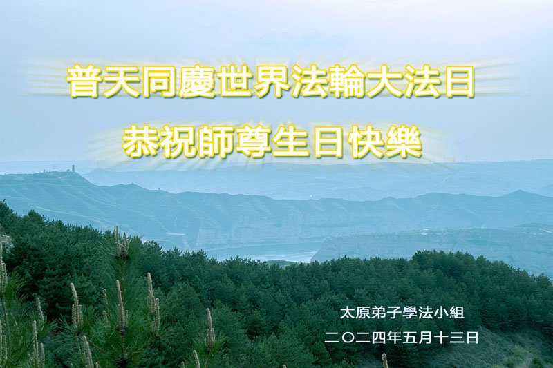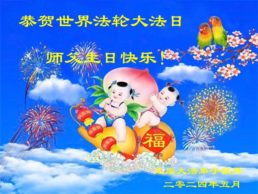 师尊下尘救众生 五月十三迎恩典 法王慈悲施洪恩 佛光普照光明显 谁解师尊慈悲意 沐浴佛光金身炼 生命归正万象新 普天同庆开新篇 山西阳泉平定学法小组大法弟子敬上 二零二四年五月十一日 山西省太原大法弟子恭祝世界法轮大法日!恭祝师尊生日快乐!