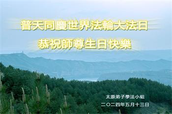 在五·一三世界法轮大法日到来之际,身陷囹圄的大法弟子敬贺世界法轮大法日,恭祝慈悲伟大的师尊华诞!无论身在哪里都无法动摇弟子信师信法的坚定正念,请师尊放心,弟子一定不辜负师尊的慈悲救度!叩拜师尊! 山西省阳泉市身陷囹圄的大法弟子 二零二四年五月十二日 山西省太原南城及西山大法弟子恭祝师父生日快乐!普天同庆世界法轮大法日!