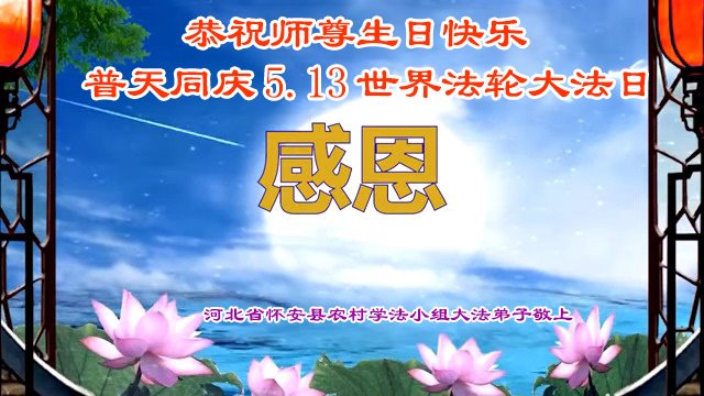 在这“五·一三”世界法轮大法日这普天同庆的日子里,感恩的心情无以言表。 弟子叩拜师尊!祝师尊生日快乐! 黑龙江省牡丹江市林口县一农村大法弟子敬上 山东省潍坊昌邑全体农村大法弟子恭祝师父生日快乐!