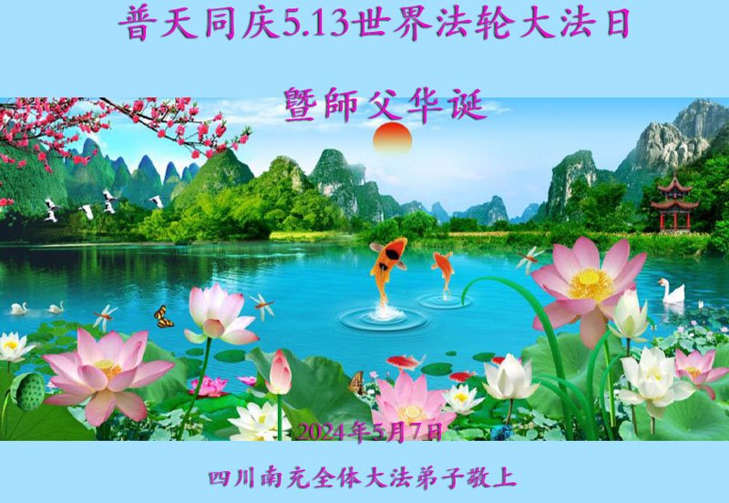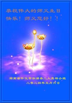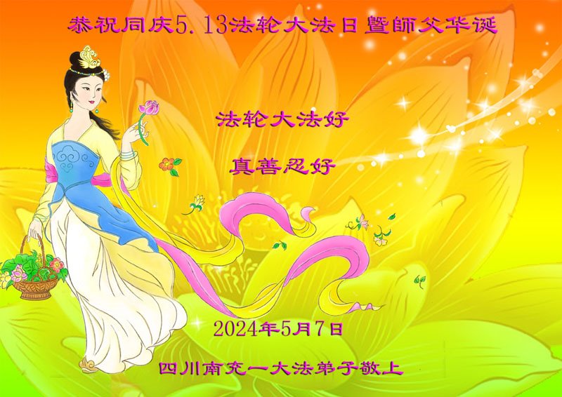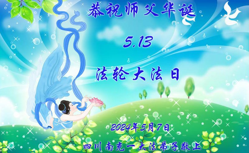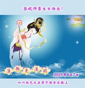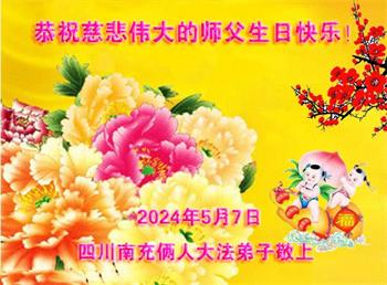 我修炼法轮大法,我们全家人都受益,我们全家人都感谢师父慈悲救度!弟子无法用语言来表达对师父的感恩,只有努力做好三件事,报答师尊,跟师父回家。 四川南充全体大法弟子恭祝师尊生日快乐!
