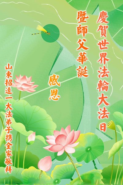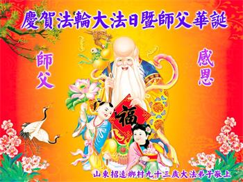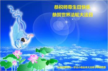 山东招远一大法弟子携全家庆贺世界法轮大法日暨师父华诞!