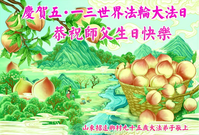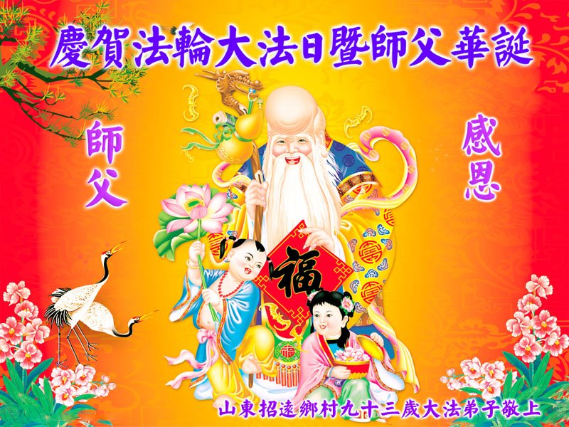 山东招远乡村九十五岁大法弟子庆贺法轮大法日!恭祝师父生日快乐!