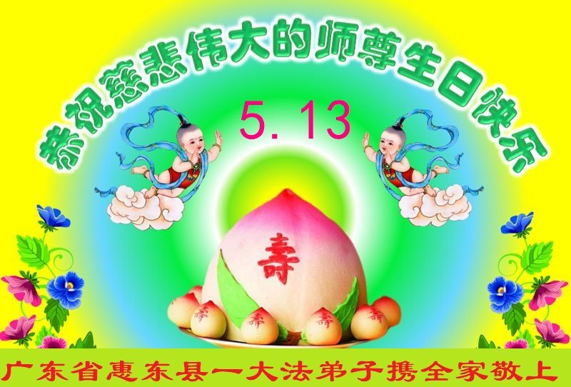 广东省惠州市惠东县一大法弟子携全家恭祝师尊生日快乐!
