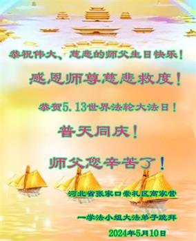 【明慧网二零二四年五月十五日】 河北石家庄市井陉县一大法弟子及家人同修恭祝师父生日快乐!祝贺世界法轮大法日!