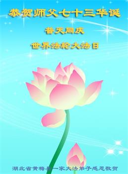 湖北省黄冈市黄梅县一家大法弟子恭祝师父华诞!恭祝法轮大法洪传32周年!