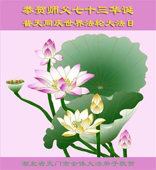 恭祝师父华诞!恭祝法轮大法洪传32周年! 湖北省黄梅县一家大法弟子敬上 湖北省天门全体大法弟子恭祝师父华诞!恭祝法轮大法洪传32周年!
