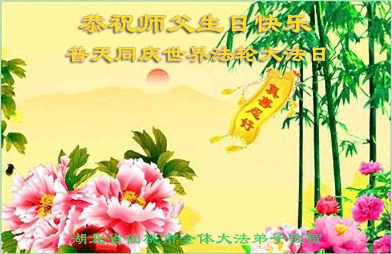 湖北省仙桃市全体大法弟子恭祝师父生日快乐!恭贺世界法轮大法日!