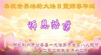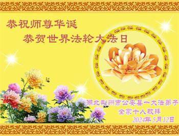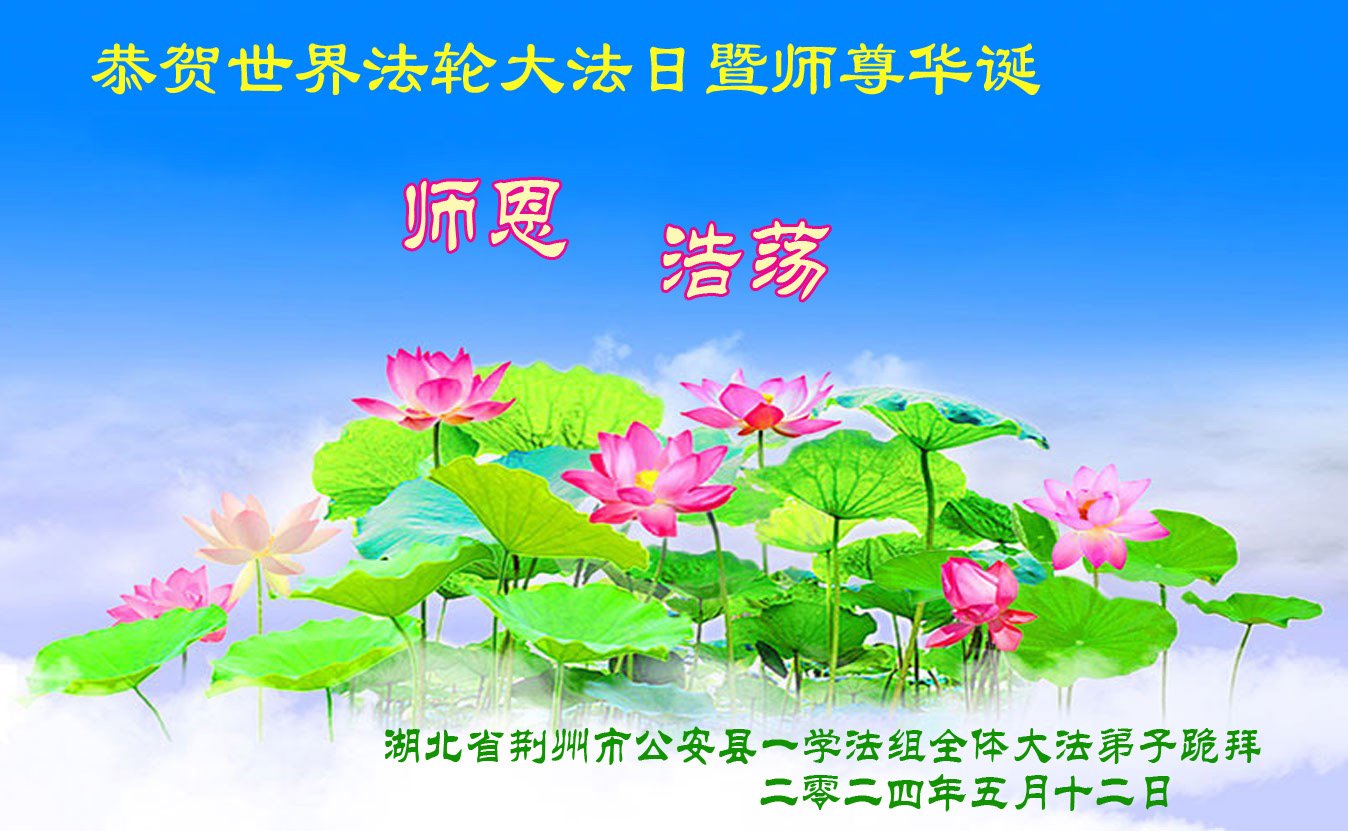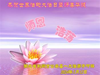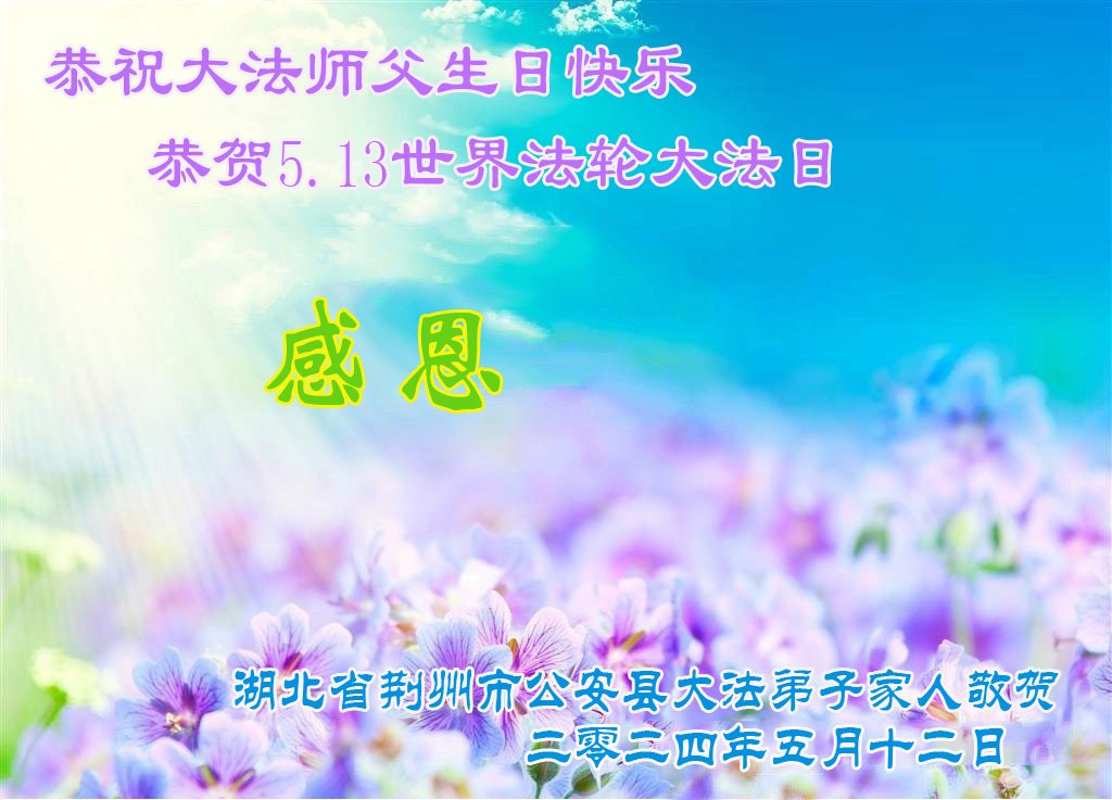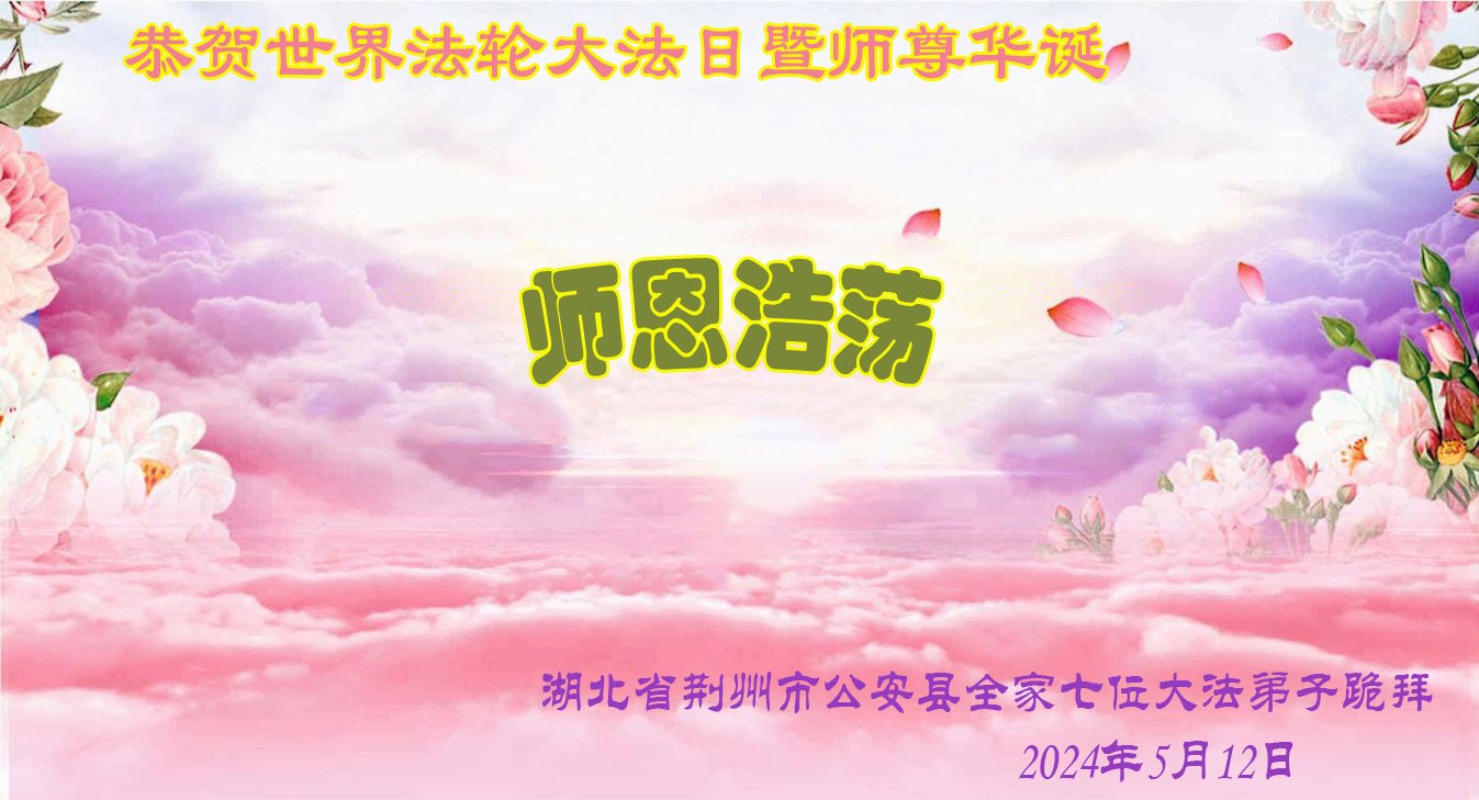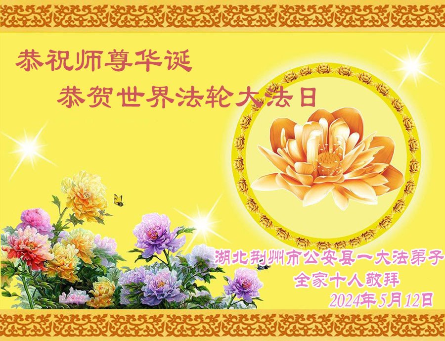 【明慧网二零二四年五月十六日】 湖北省荆州市公安县大法弟子家人恭祝大法师父生日快乐!恭贺世界法轮大法日!