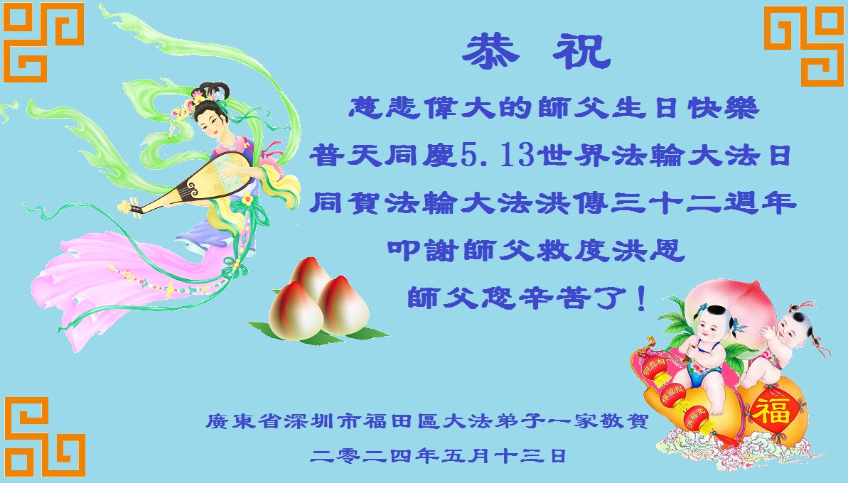 普天同庆五·一三世界法轮大法日!师尊:您辛苦了!你对弟子巨大的承受、付出、时时用不同的方式点悟弟子,弟子无以言表。感恩伟大的师尊巨大的洪恩!在正法接近尾声的这段时间里,弟子只有学好法,用心做好三件事,实实在在的修好自己,同化大法,救度众生,助师正法,不负大法救度之恩。合十! 深圳市福田区大法弟子一家恭贺法轮大法日!