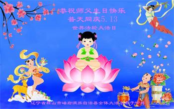 青岛平度母女二位大法弟子恭贺世界法轮大法日! 二零二四年五月十一日 辽宁省鞍山市岫岩满族自治县全体大法弟子恭祝师尊生日快乐!