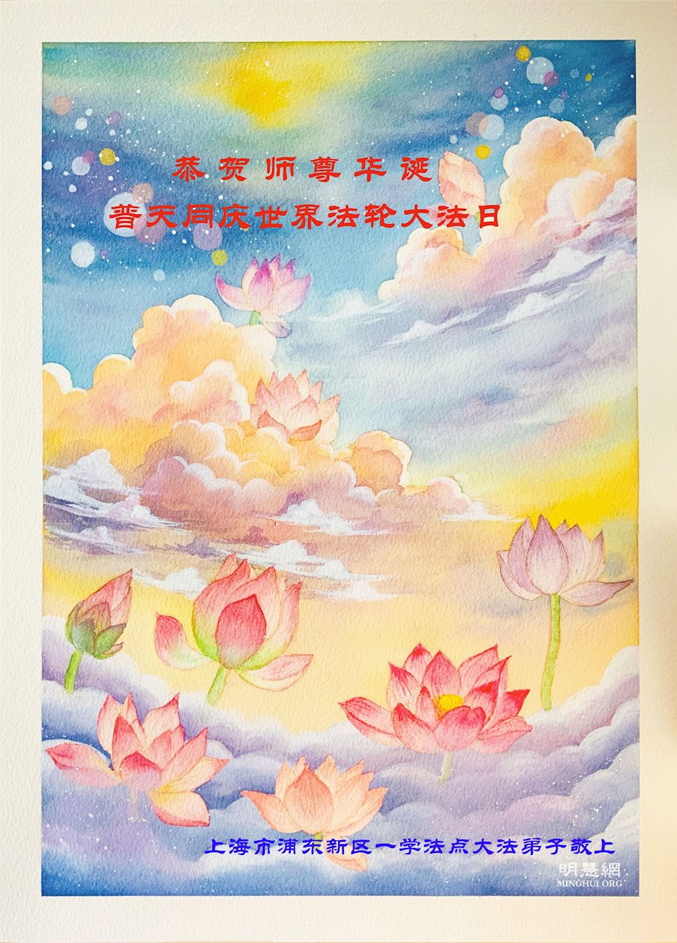 感恩师父一路的慈悲苦度,谢谢师父对弟子们付出的一切,弟子们唯有精進、再精進,才能回报师恩!佛恩浩荡!弟子们恭祝慈悲伟大的师父生日快乐!弟子们替得救众生跪拜师父,谢谢师父! 深圳市福田区大法弟子一家敬贺 大法弟子家属绘画《荷花》庆祝5月13日世界法轮大法日!