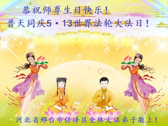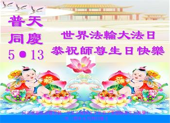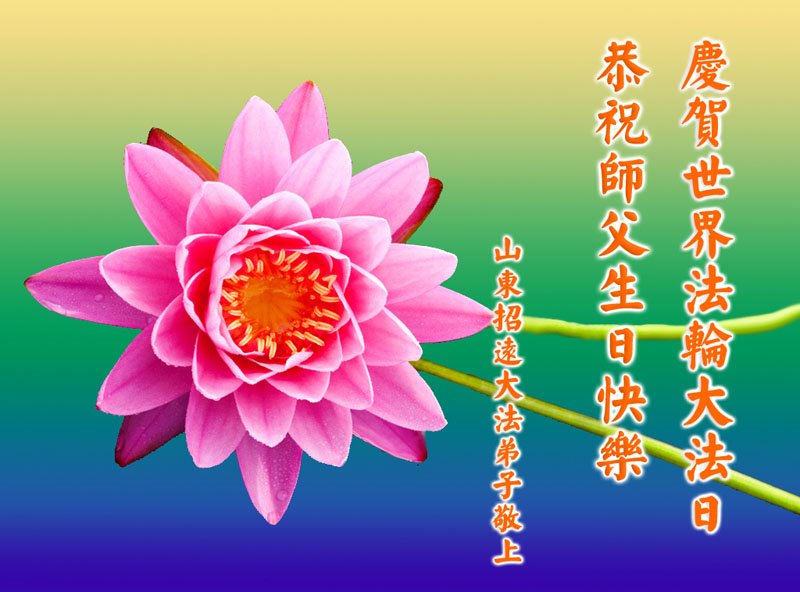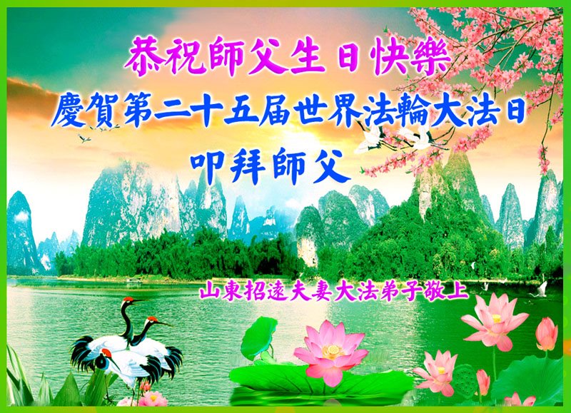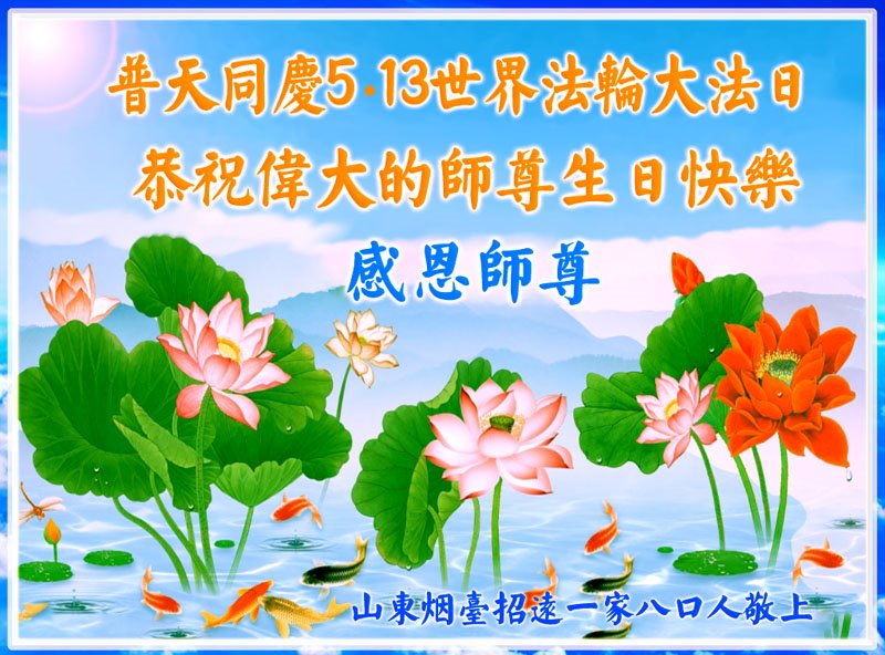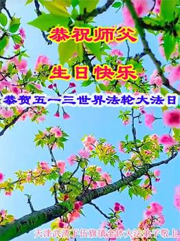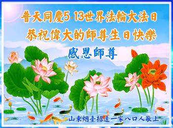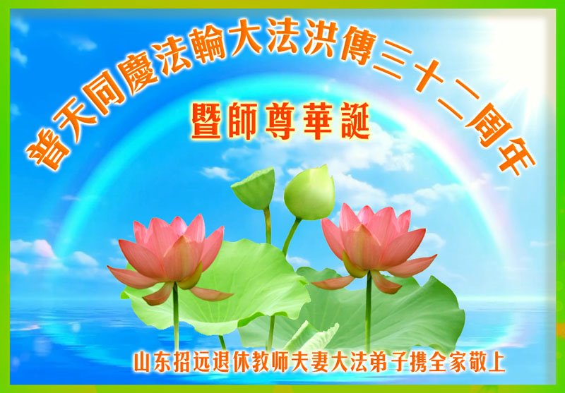 在五一三世界法轮大法日即将到来之际,我们全家人恭祝这个伟大节日并祝师父生日快乐!我们坚信师父,坚修大法,走好最后修炼路,迎接美好未来。 山东省烟台市招远市两位大法弟子恭贺世界法轮大法日暨师尊华诞!