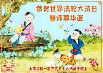 山东省烟台市招远市一家三代五个大法弟子庆贺世界法轮大法日暨师父华诞!