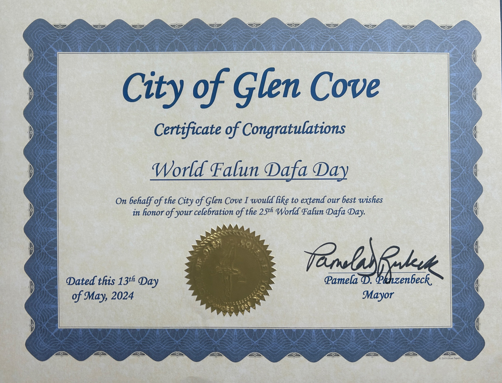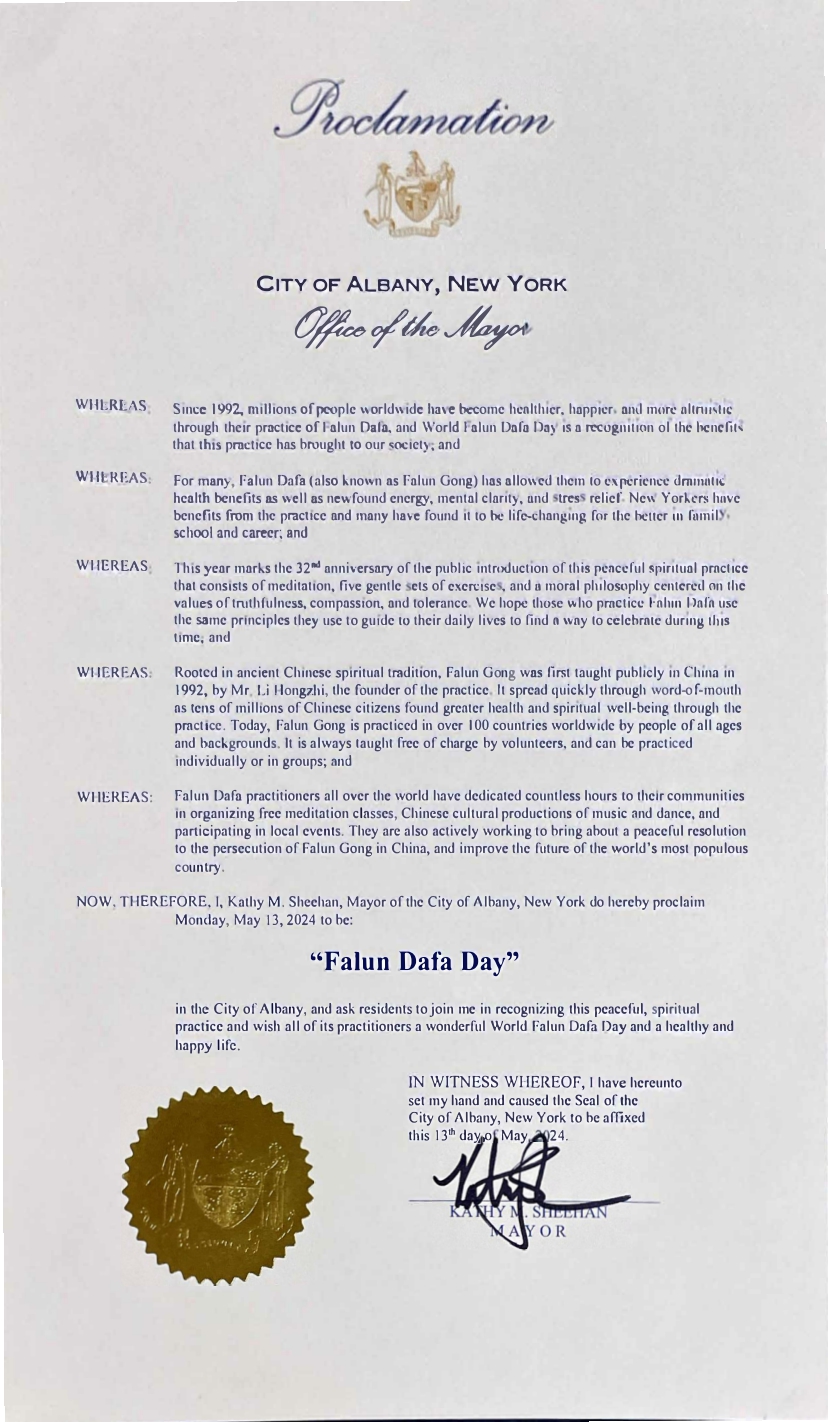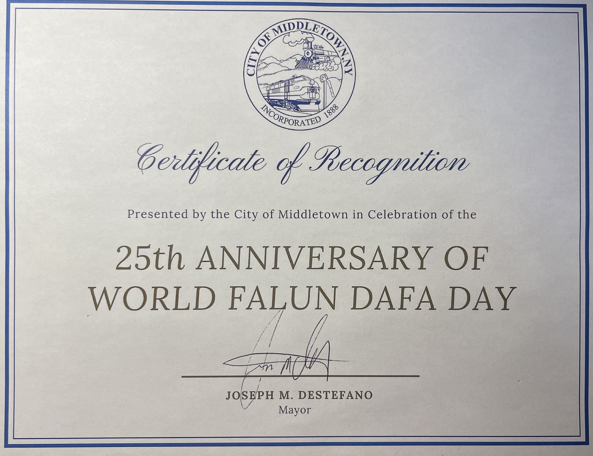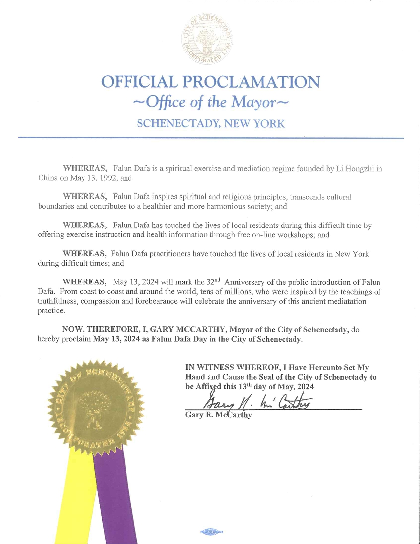 | 【明慧网二零二四年五月二十三日】二零二四年五月十三日是第二十五届“世界法轮大法日”,也是法轮大法传世三十二周年,更是慈悲伟大的师尊华诞。美国纽约州多个市县发出褒奖贺信,祝贺这个举世欢庆的伟大节日,颂扬法轮大法的真、善、忍理念,并感谢法轮功学员多年来对社区所做出的卓越贡献。 纽约州首府奥伯尼市(City of Albany)市长凯瑟琳·希恩(Katherine M. Sheehan)和邻近的斯克内克塔迪市(City of Schenectady)市长加里·麦卡锡(Gary R. McCarthy)发来褒奖,宣布二零二三年五月十三日为奥伯尼市和斯克内克塔迪市的“法轮大法日”。 褒奖令译文如下: 纽约州首府奥伯尼市市长:“世界法轮大法日”是对这一伟大功法造福社会的肯定 图1~2:纽约州首府奥伯尼市市长凯瑟琳·希恩和她颁发的褒奖令纽约州首府奥伯尼市市长凯瑟琳·希恩颁发的褒奖令说道: 鉴于,自一九九二年起,全世界一亿多人通过修炼法轮大法,变得更加健康、快乐、利他。世界法轮大法日是对这一伟大功法造福社会的肯定;并且 鉴于,对于许多人来说,法轮大法(又称法轮功)使他们体验到了巨大的健康益处,前所未有的充沛精力,头脑清晰和压力缓解。纽约人从此功法中受益,许多人发现此功法使他们的生活,家庭,学业和职业生涯都变得更好;并且 鉴于,今年是平和的法轮大法公开传出的第三十二周年,法轮大法由包括打坐在内的五套柔和的功法和以真、善、忍的价值观为中心的道德哲学组成。尽管今年的庆祝活动将与往年有很大不同,但我们希望那些修炼法轮大法的人们能继续在同样的原则指导下,在这非常时期找到自己的庆祝方式;并且 鉴于,法轮大法植根于中国古老的传统文化,由李洪志先生创立并于一九九二年在中国公开传出。口耳相传,数千万民众通过修炼,身心极大受益。今天,世界上有一百多个国家、不同年龄、不同背景的民众修炼法轮功。法轮大法一直是义工免费教功,既可以自己炼功,也可以集体炼功;并且 鉴于,全世界法轮大法修炼者投入无数小时,致力于在社区提供免费教功、推广中国音乐、舞蹈文化、并参加社区活动。他们同时还致力于和平停止在中国对法轮大法的迫害,为世界人口最多的国家带来美好的未来; 鉴此,我,希恩(Kathy M. Sheehan),纽约州奥伯尼市市长宣布二零二四年五月十三日为奥伯尼市“世界法轮大法日”。 我恳请奥伯尼市居民和我一起,肯定这一和平的修炼方法,祝愿所有法轮大法修炼者世界法轮大法日快乐,生活健康愉悦。 作为凭证,在二零二四年五月十三日我亲笔签名如下, 凯瑟琳·希恩 市长 纽约州斯克内克塔迪市长:法轮大法提升人的精神与信仰,超越文化 图3~4:纽约州斯克内克塔迪市市长加里·麦卡锡和他颁发的褒奖令纽约州斯克内克塔迪市(City of Schenectady)市长加里·麦卡锡(Cary R.McCarthy)颁发的褒奖令如下: 鉴于,法轮大法是一门打坐和自我提升的修炼方法,由李洪志先生于一九九二年五月十三日创立;以及 鉴于,法轮大法提升人的精神与信仰,超越文化,促进人们的身心健康与社会和谐;以及 鉴于,在这段大瘟疫流行的困难时期,本地的法轮大法修炼者组织网上免费教功和信息咨询,很多本地人因此了解了法轮大法;以及 鉴于,本地法轮大法修炼者将法轮大法的美好传播到纽约州;以及 鉴于,二零二四年五月十三日是法轮大法传世三十二周年,来自全世界各个角落的千万名在法轮大法真、善、忍的修炼原则感召下走入法轮大法修炼的人们将一起庆祝这个日子; 因此,我加里·麦卡锡,斯克内克塔迪市市长,在此宣布二零二四年五月十三日为斯克内克塔迪市法轮大法日,并祝愿他在今后的工作中一切顺利。愿他的足迹有一天能回到斯克内克塔迪。 我于二零二四年五月十三日亲笔签名并加盖斯克内克塔迪市的印章,以资证明。 加里·麦卡锡(签名) 纽约橙县米德尔敦市庆祝“第二十五届世界法轮大法日” 图5~6:纽约橙县米德尔敦市市长约瑟夫·德斯特法诺和他颁发嘉奖证书纽约橙县米德尔敦市(City of Middletown)市长约瑟夫·德斯特法诺(Joseph M. DeStefano)颁发嘉奖证书,庆祝“第二十五届世界法轮大法日”。 纽约长岛格伦科夫市市长:颁发褒奖,祝贺“第二十五届世界法轮大法日” 图7~8:纽约长岛格伦科夫市市长帕梅拉·岑贝克和他颁发褒奖证书纽约长岛格伦科夫市(Mayor of Glen Cove)市长帕梅拉·岑贝克(Pamela D. Panzenbeck)颁发褒奖证书,庆祝“世界法轮大法日”。  图9:纽约长岛萨福克郡议会主席褒奖信 |