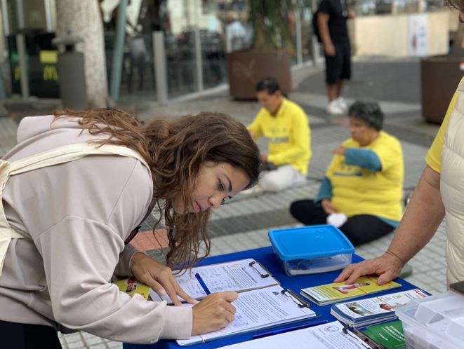 大加那利岛位于大西洋中的加那利群岛东北部的拉斯帕尔马斯,是加那利自治区的首府之一和拉斯帕尔马斯省的首府,也是加那利群岛中最大的城市。大加那利岛因其四季如春的独有的气候和地形地貌(由火山喷发而形成)而被称为“微型大陆”,因此被联合国教科文组织认定为生物圈保护区。这里也是各国游客喜爱的旅游胜地。 法轮功学员刚刚把真相信息展位摆放好,便立刻吸引了过往民众的目光,不断有人前来了解真相并签名表达对法轮功反迫害的支持。  图8:活动当天,第一个在请愿书上签名的女士。 |