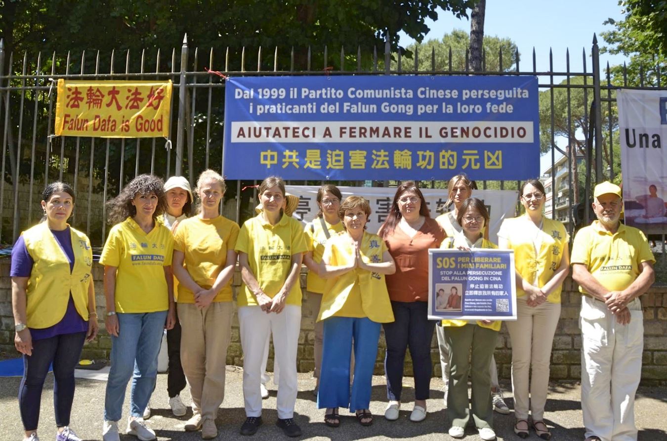 图2:意大利参议院人权委员会委员、欧盟政策委员辛齐亚·佩莱格里诺(Cinzia Pellegrino)(右5)和法轮功学员一起参加中领馆和平抗议活动。 |