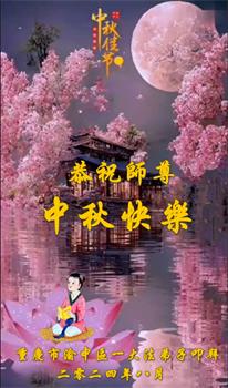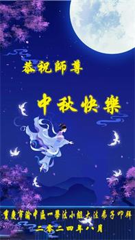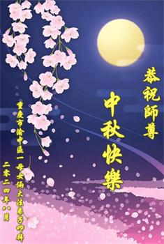 师尊您好,师尊辛苦了!敬祝伟大师尊中秋节快乐! 感恩师尊慈悲苦度,传授我们法轮大法,让我们走在返本归真的神路上。弟子要做好三件事,多救人,兑现史前誓约,圆满随师还。 重庆沙坪坝一学法小组大法弟子敬上 重庆市九龙坡区一学法小组大法弟子恭祝师尊中秋快乐!