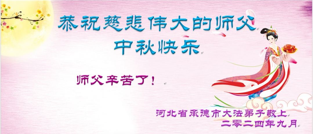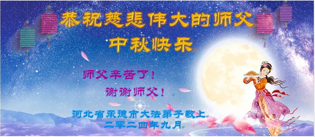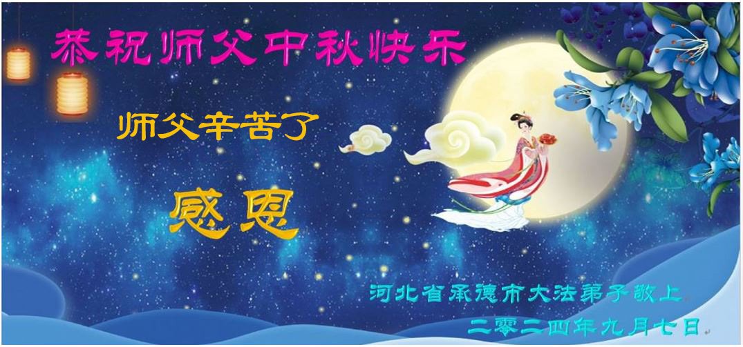明月圆又圆,弟子盼师还!在中秋节即将到来之时,恭祝慈悲伟大的师父中秋节快乐! 感谢师父对弟子的看护与点化,使我们走到了今天。弟子将全力做好三件事,让师父多一点欣慰,少一点操心。圆满随师还! 河北省泊头市全体大法弟子敬上 二零二四年九月八日 河北省承德市大法弟子恭祝师父中秋快乐!