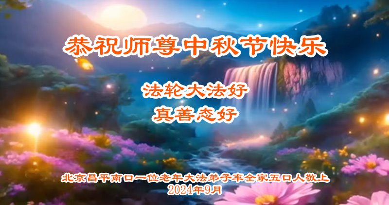 恭祝师尊中秋节快乐! 北京市昌平区南口地区一位老年大法弟子全家五口人敬上 2024年9月 北京市延庆区全体大法弟子恭祝慈悲伟大的师尊中秋节快乐!