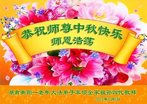 恭祝慈悲伟大的师尊中秋快乐! 湖南省衡阳一老年大法弟子率全家祖孙四代敬上 2024年9月6日 湖南省衡阳三位大法弟子恭祝慈悲伟大的师尊中秋快乐!