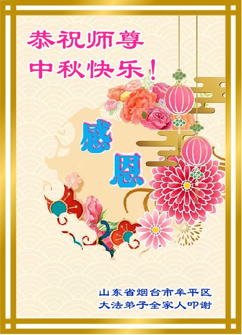 师尊您好! 您为众生耗尽了一切,将无比珍贵的大法恩赐苍生,每时每刻都在承受着众生无量的罪业!弟子泪谢师尊救度洪恩! 山东省烟台市牟平区一大法弟子敬上 山东省烟台市栖霞市一大法弟子携全家人恭祝师尊中秋好!