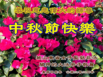 我是刚从黑窝回来的,感恩师父,我在监狱出现了病业假相,没有师父我的生命就没有了,师父为我承受的太多了,我无以为报。弟子唯有做好自己应该做的,不负师恩。 被非法关押在山东省监狱家属院的大法弟子恭祝慈悲伟大的师尊中秋佳节快乐!