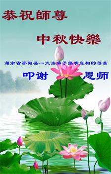 一年一中秋,一跪三叩首!在中秋佳节来临之际,我和家人同修及明真相的家人感恩慈悲伟大师尊的苦度和时刻看护!感恩师尊的无上恩典!弟子一定走好走正师尊安排的修炼道路,紧跟师尊正法進程,一思一念同化大法,时时刻刻向内找,做好三件事,来回报师尊洪恩之万一。 湖南省邵阳县一大法弟子携明真相的母亲恭祝师父中秋快乐!