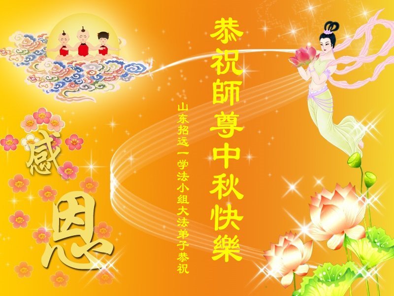 中秋之际,恭祝师父节日快乐! 感谢师父洪传大法,让我们走上返本归真之路!感谢师父再造之恩! 弟子要加倍学法,按照真、善、忍的原则要求自己,努力做好三件事,报答师父的慈悲苦度! 山东省烟台市招远市一老年大法弟子敬上 山东烟台一大法弟子全家恭祝慈悲伟大的师尊中秋快乐!