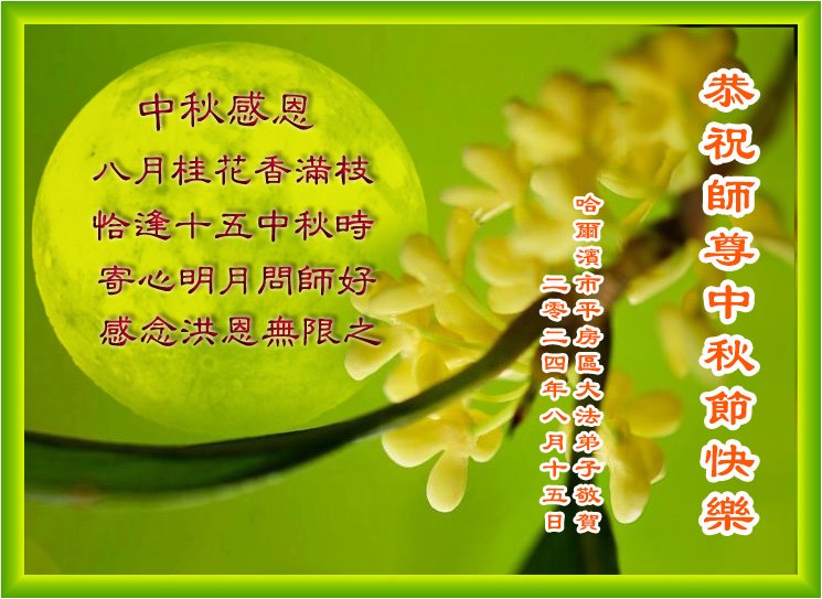 恭祝师尊中秋节快乐! 中秋感恩 八月桂花香满枝 恰逢十五中秋时 寄心明月问师好 感念洪恩无限之 黑龙江省哈尔滨市平房区大法弟子敬上 二零二四年九月十四日 黑龙江省哈尔滨市一大法弟子恭祝师父中秋快乐!