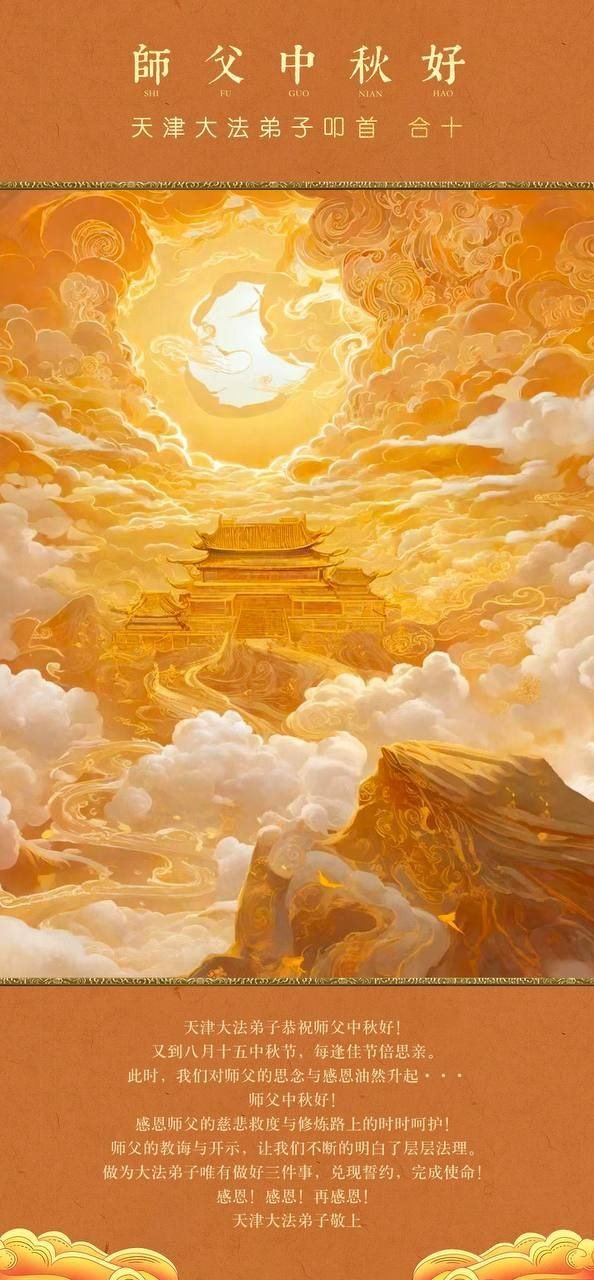 恭祝师尊中秋快乐! 天津一大法弟子敬上 二零二四年九月十四日 天津大法弟子恭祝师尊中秋快乐!