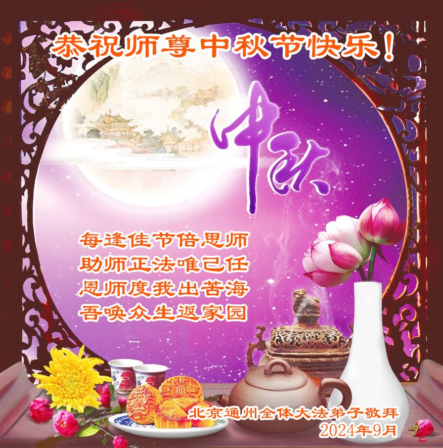 恭祝师尊中秋快乐! 每逢佳节倍思师 助师正法唯己任 恩师度我出苦海 吾唤众生返家园 北京通州全体大法弟子叩谢 2024年9月14日 北京一大法弟子恭祝师尊中秋节快乐!
