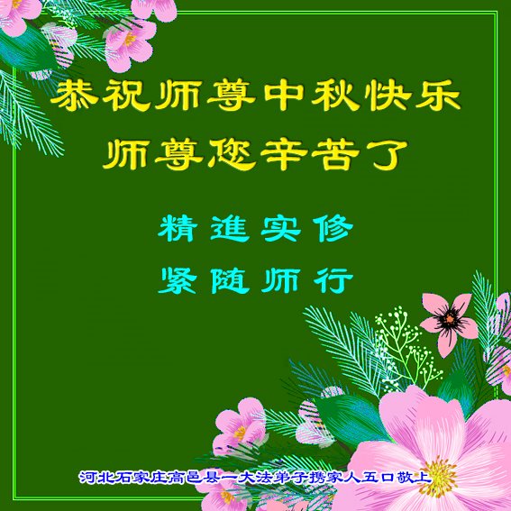 弟子一定不辜负师尊的期望,学好法,做好三件事,跟师父回家。 河北省石家庄市一家五口大法弟子恭祝师父中秋快乐!