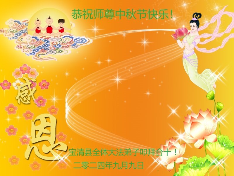 大法开创新世纪 恩师慈悲度穹宇 弟子感恩得救度 随师正法破党迷 众生期待闻真相 生命得救入新宇 中秋佳节送祝愿 摇寄心语表心意 黑龙江省大庆市杜尔伯特县全体大法弟子敬上 二零二四年九月十三日