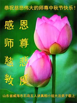 师父您好:大法弟子全家五口人恭祝师父中秋节快乐!感谢师父的慈悲苦度!弟子只有精進做好三件事多救人! 谢谢师父! 山东省招远市大法弟子全家五口人敬上 山东省威海市石岛母女大法弟子恭祝慈悲伟大的师尊中秋节快乐!