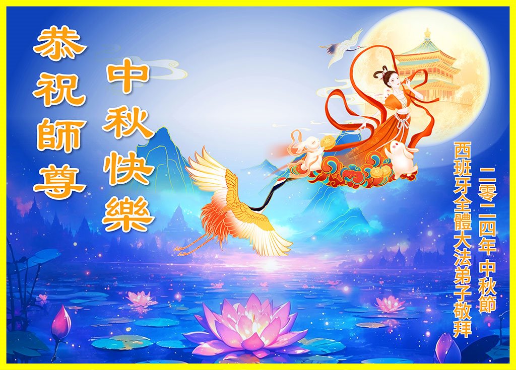 弟子叩谢师恩!师尊为弟子、为众生的承受和付出,弟子无法用语言来描述,唯有对师尊无限的感恩!盼师尊多欣慰,少操劳!请师尊放心,弟子会谨记您的教导,在修炼中时时保持正念正行,更加勇猛精進多救人。 西班牙全体大法弟子恭祝慈悲伟大的师尊中秋快乐!