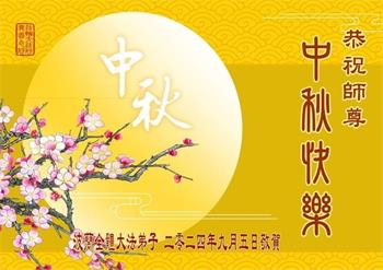 秋凉如水,月色皎洁如露。 佛光普照,恩泽浩荡, 载乾坤,度众归。 洗凡尘,净人心,除妄念。 明月诚可鉴,正念法中行。 台湾桃园杨梅大法弟子敬上 旧金山大.纪.元;和新!唐!人:大法弟子恭祝师尊中秋节快乐!