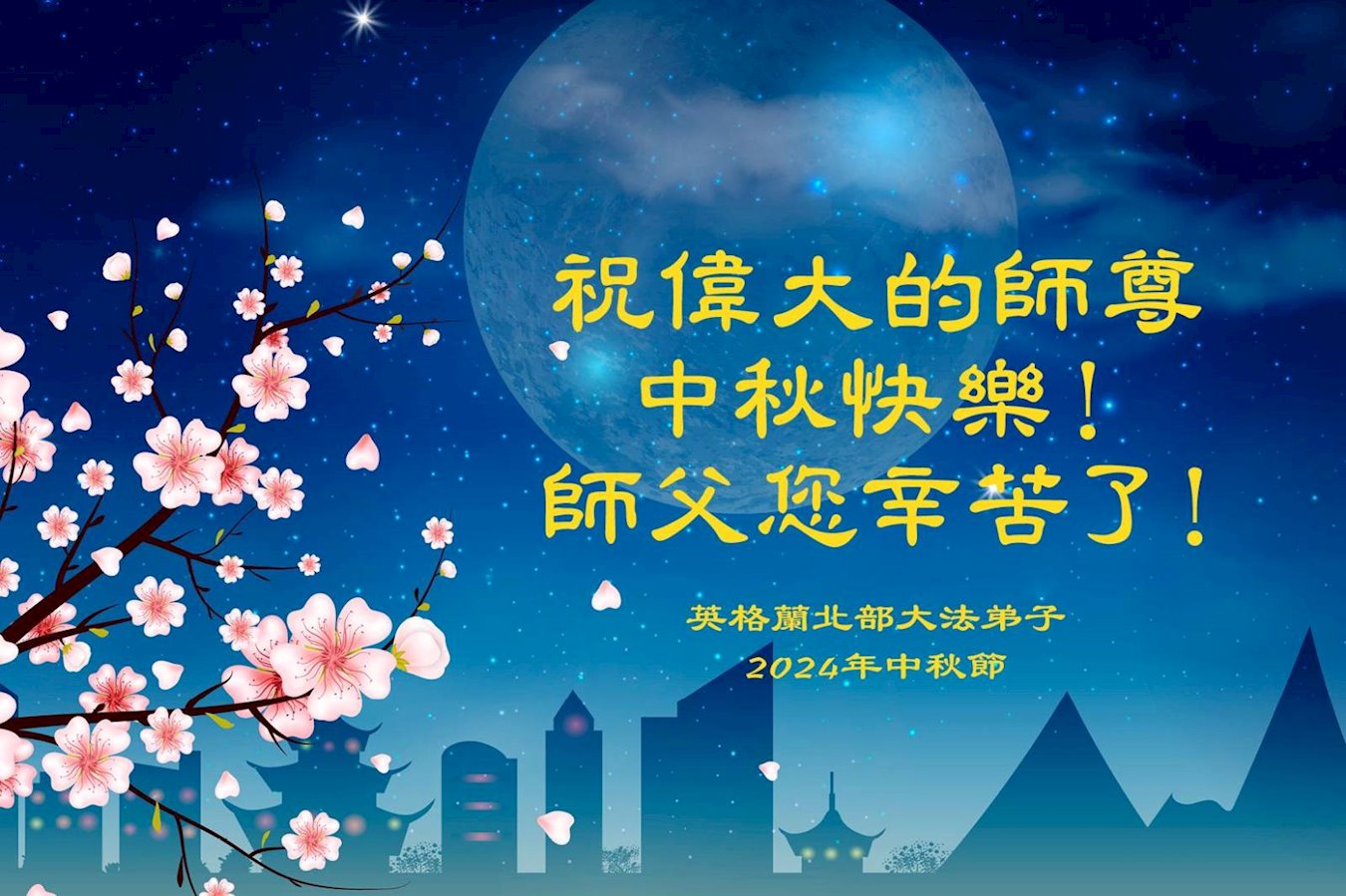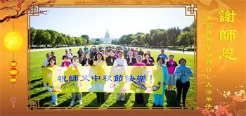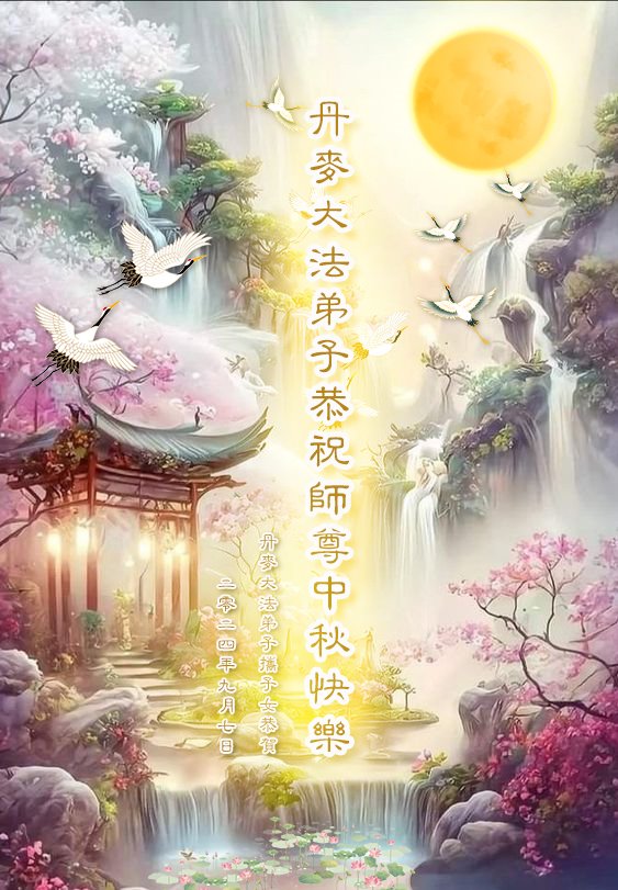 | 【明慧网二零二四年九月十七日】(明慧网记者综合报道)“明月出天山,苍茫云海间”。二零二四年中秋佳节来临,海内外各国大法弟子们深深感念师尊救度之恩,恭祝师尊中秋节快乐!在此瞬息万变、法正人间之势迅猛推進之时,弟子们会谨记师尊教导,精進如初,多救人。 以下是来自各个国家和地区的大法弟子们敬献师尊的节日问候,这些国家和地区包括:日本、厄瓜多尔、奥地利、德国、香港、新加坡、瑞典、印度尼西亚、法国、英国、丹麦、西班牙、荷兰、瑞士、苏格兰、台湾、越南、菲律宾、澳大利亚、新西兰、美国、罗马尼亚、波兰、韩国、马来西亚、叙利亚、俄罗斯、芬兰、匈牙利、爱尔兰、加拿大、泰国、意大利、丹麦、葡萄牙、希腊、乌克兰、保加利亚、挪威、波斯尼亚和黑塞哥维那、塞尔维亚、比利时、伊朗、印度、老挝、沙特阿拉伯、蒙古国、以色列、哈萨克斯坦、巴西、秘鲁、澳门、墨西哥。 美国华盛顿DC大法弟子恭祝师尊中秋节快乐!