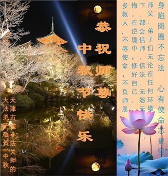 身陷囹圄不忘法,心有使命志更坚。师父,弟子们无论在任何环境下都会信师、信法,无怨无悔。在逆境中修好自己,多救人,不辱使命,不负师恩。天津市被非法关押的大法弟子敬上 被非法关押在齐齐哈尔泰来监狱的大法弟子恭祝师尊中秋快乐!