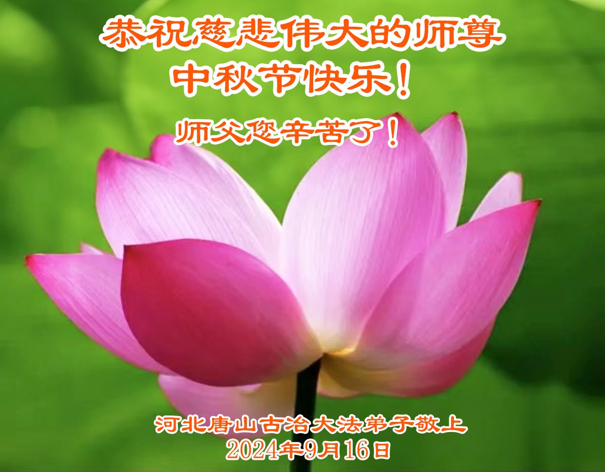 迁安大法弟子:感恩师尊慈悲苦度! 恭祝师尊中秋快乐! 叩拜师尊 2024年9月16日 河北省唐山市迁安市一学法小组大法弟子恭祝师尊中秋快乐!