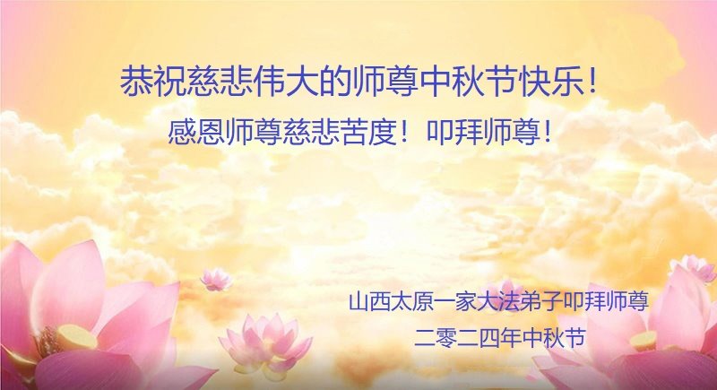 在中秋佳节之际,弟子恭祝慈悲伟大的师尊中秋节快乐!无论时日长短,无论什么样的环境下,弟子都跟随师尊,坚信大法不动摇。修好自己,救度有缘人,不忘使命,跟师父回家。 山西省一大法弟子敬上 二零二四年九月十五日 山西省汾西大法弟子恭祝师尊中秋节快乐!