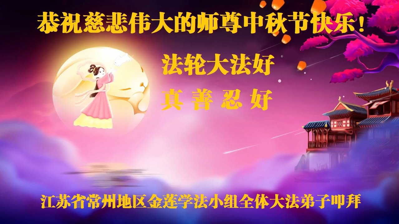 江苏省常州地区一学法小组大法弟子恭祝伟大慈悲的师父中秋节快乐! 弟子们跟随师尊走过了二十八个年头,已是步入耄耋之年的大法弟子。感恩师尊以巨大的承受和付出让众生又迎来了一个中秋团圆节,弟子们向师尊呈上最诚挚的感恩!惟愿师尊笑!弟子们将修炼如初,理智、清醒的走好师尊安排的最后正法修炼之路!让师尊放心! 江苏省常州地区一学法小组大法弟子敬上 江苏镇江一大法弟子恭祝师尊中秋快乐!
