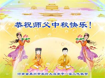 师尊您好!我们是96年得法的大法弟子,风雨中有师尊的慈悲护佑与不离不弃才走到今天。师恩浩荡,难以回报。我们一定精進实修,做好三件事,兑现誓约,跟师父回家。 河南大法弟子携家人恭祝师尊中秋节快乐!