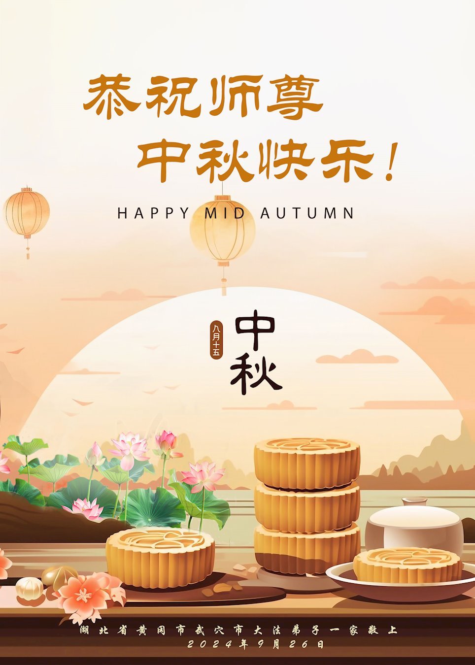 中秋节到了,弟子恭祝师尊中秋快乐! 感恩慈悲伟大师尊的洪恩救度!谢谢师尊!叩拜师尊!做好大法三件事、修好心性、在正法最后的最后多救人,兑现来世的誓约,圆满随师还! 湖北武汉一家大法弟子敬上 二零二四年九月一十六日 湖北武汉一家大法弟子敬上 湖北省荆州市洪湖市法轮功学员恭祝慈悲伟大的师父中秋节快乐!