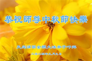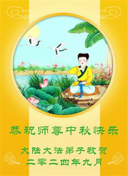 师尊您好!师尊您辛苦了!在助师正法的路上,师尊一直在看护弟子们,用大法的法理,点悟着弟子们,弟子们的成长离不开您的护佑。在以后救度众生的路上,弟子们将精進不怠,让师尊少一些操心,多一份安慰。叩谢恩师! 大陆大法弟子及家人六口敬上 二零二四年八月二十八日 中国大陆一大法弟子恭祝师尊中秋节快乐!